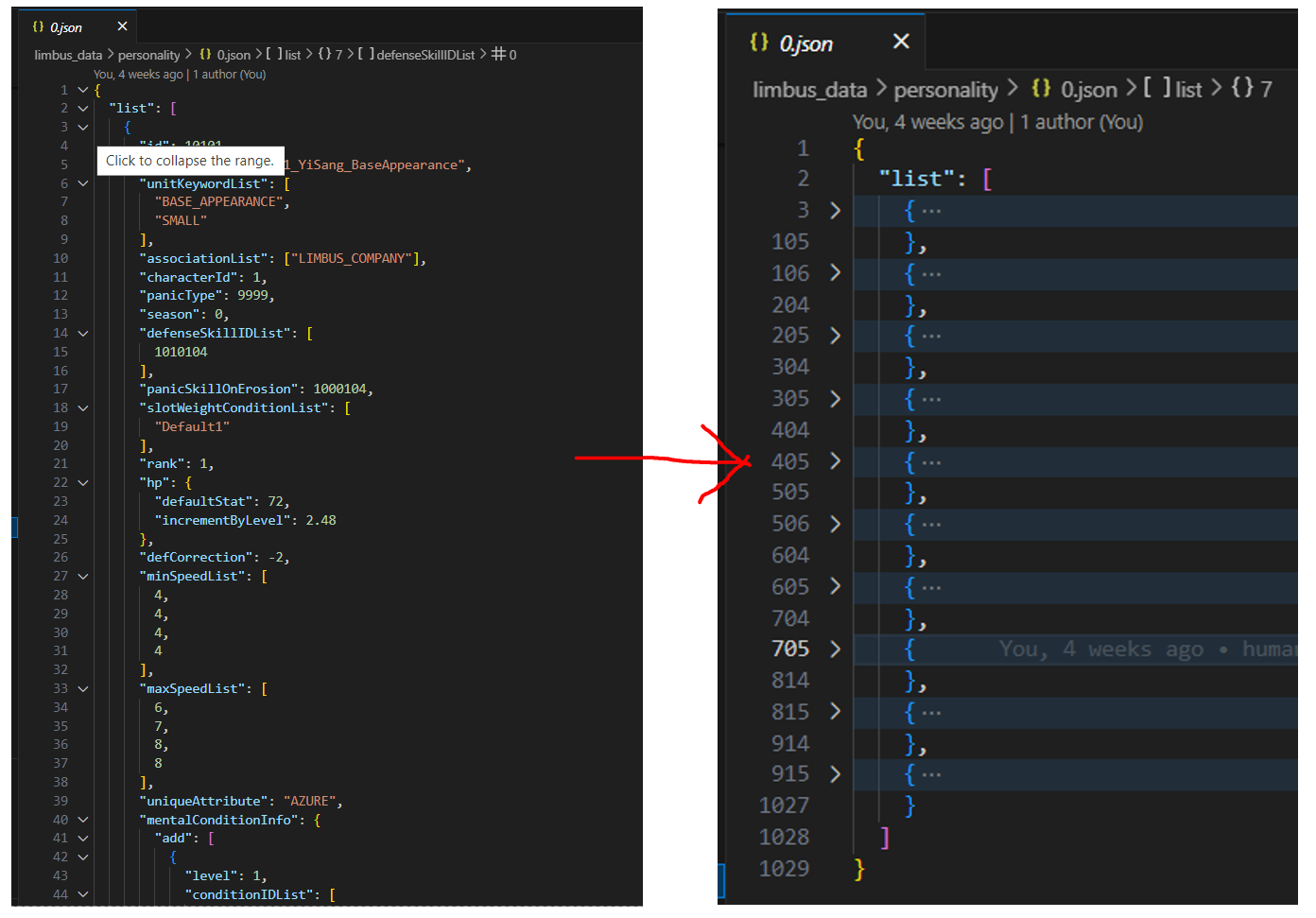 - You will be dealing with many .json files are essentially a massive list, and I would highly recommend you use Visual Studio Code's built-in feature of closing down certain parts of your code (as seen in the image below). This is quite handy as it allows us to more easily grasp how personalities/skills/etc actually work. Everything is just another entry in a long "list".