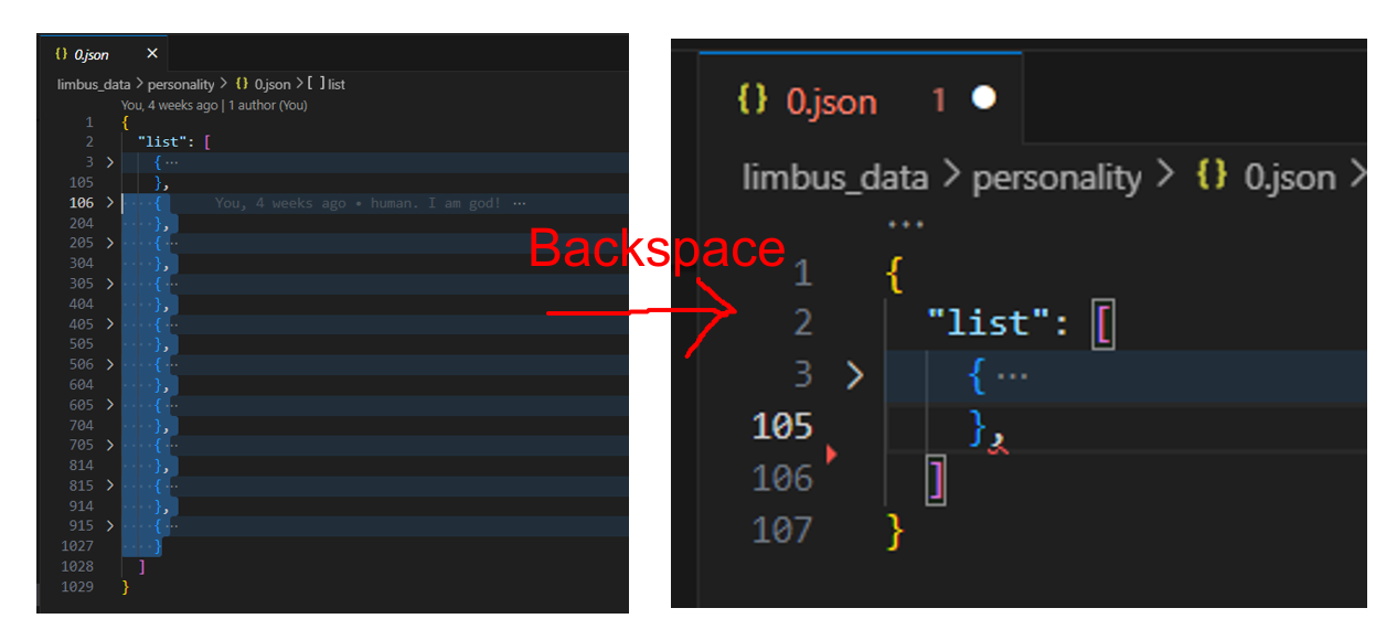 Now let's go and trim the fat. Delete all the other personalities in our json file except for the one we wish to further work on.