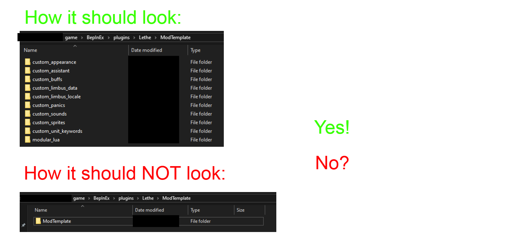 Correct: Lethe/mods/the mod name/(the actual data, so things like custom_limbus_data)